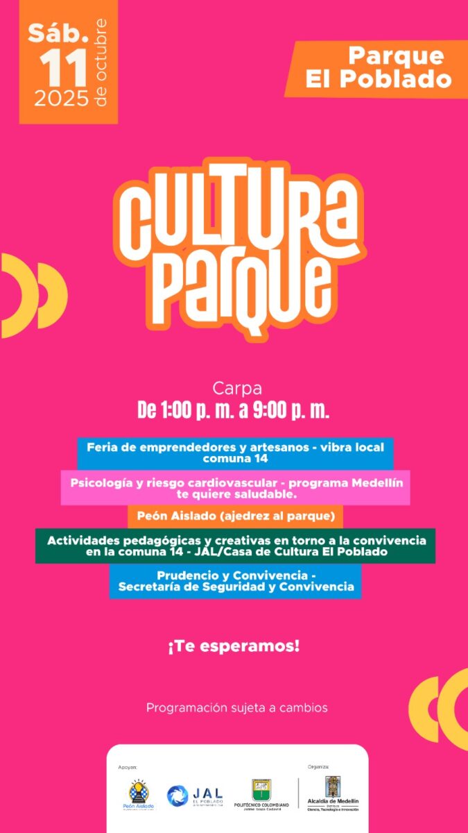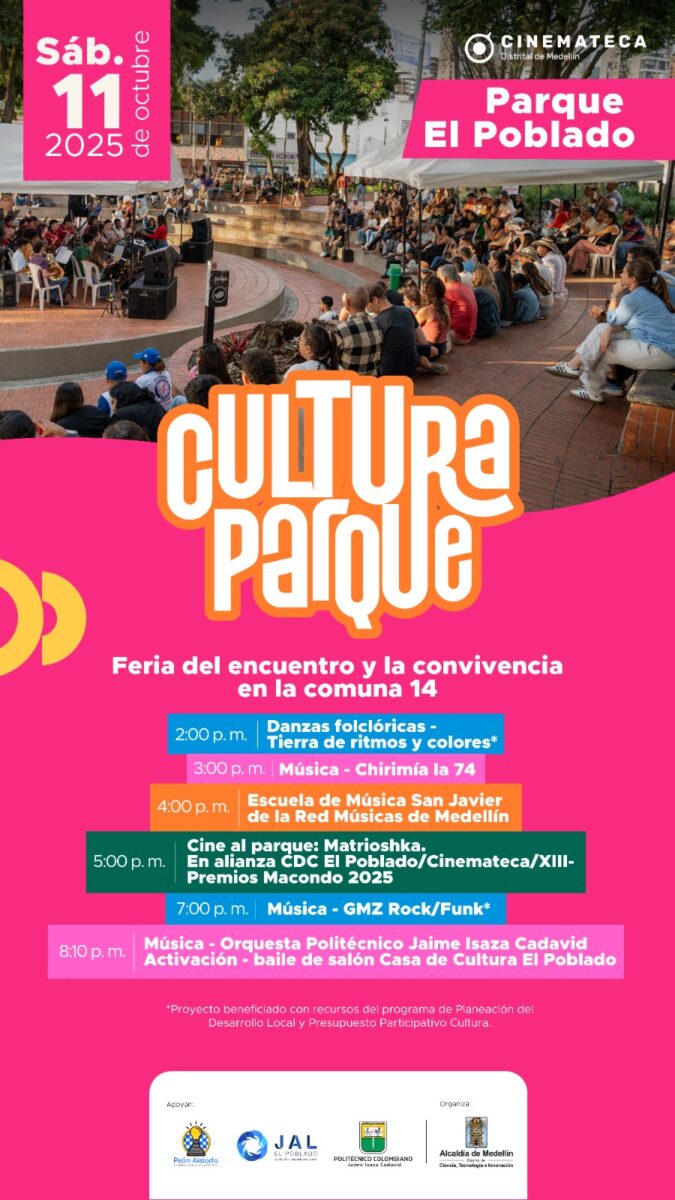 Desde la 1:00 p. m. y hasta las 9:00 p. m., el Parque El Poblado será escenario de una programación diversa que incluye feria de emprendedores y artesanos locales, actividades pedagógicas y creativas sobre convivencia, espacios de salud y bienestar, y presentaciones artísticas para todas las edades. La jornada cerrará con una muestra musical con la Orquesta del Politécnico Jaime Isaza Cadavid, danza folclórica, chirimía y cine al aire libre en alianza con la Cinemateca Distrital de Medellín.