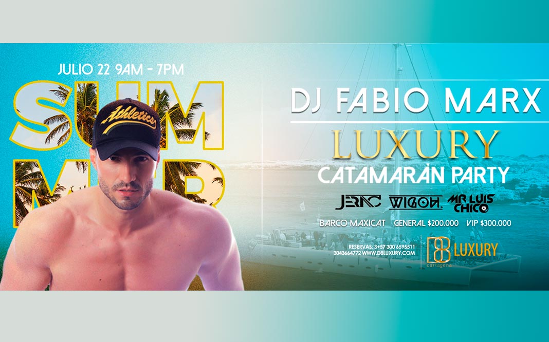 El 22 de Julio la fiesta continúa de la forma más exclusiva y lujosa, al mejor estilo de Club D8 Luxury en un espectacular Catamarán, donde bailaremos y viviremos la brisa de verano al ritmo del Dj Brasileño Fabian Marx, acompañado por una lista de Dj Nacionales para rematar esta celebración por lo alto para que te lleves los mejores recuerdos y experiencias de Club D8 en Cartagena.