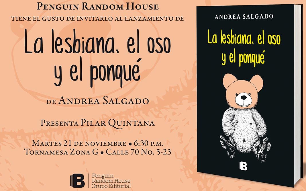 El próximo 21 de Noviembre Andrea Salgado presentará su libro “La lesbiana, el oso y el ponqué” en la librería Tornamesa G: Calle 70 #5 – 23 (Bogotá) junto a la reconocida escritora Caleña: Pilar Quintana.